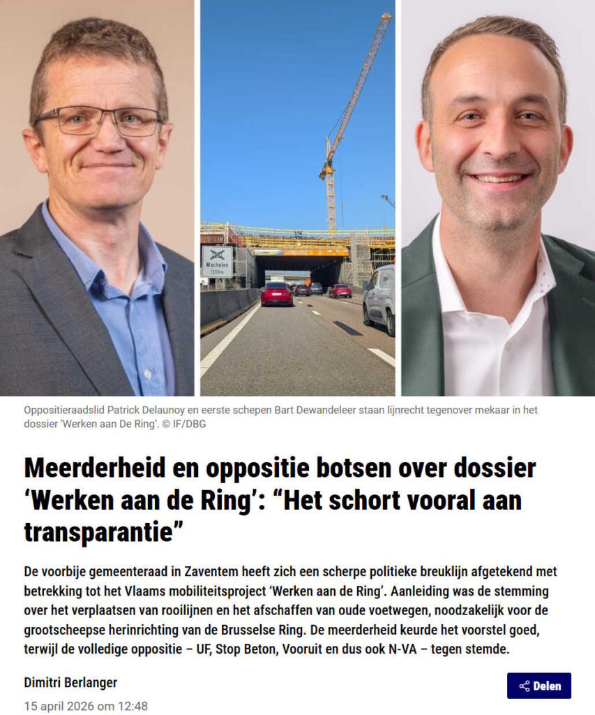 Fort contraste lors du vote du Conseil communal de Zaventem en mars. Tous les conseillers de la majorité (Anders & Team Bart) ont suivi le collège et voté POUR. De leur côté, les partis d’opposition — Stop Beton, U.F., N-VA et Vooruit — ont exprimé leurs inquiétudes et ont tous voté contre.