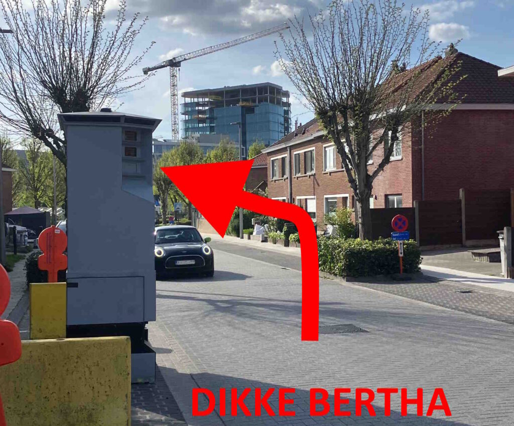 Pour terminer nous vous présentons DIKKE BERTHA, qui preste cette semaine ( 18 avril) des heures sup à la Olmenstraat à Zaventem passée en zone 30 :